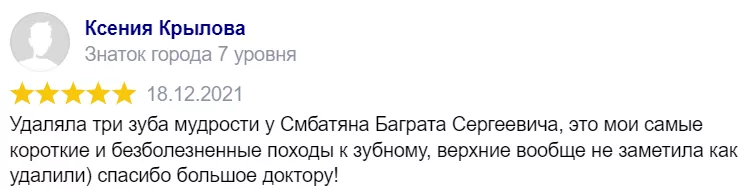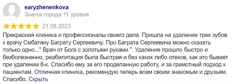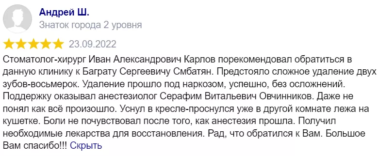 Баграт Сергеевич — врач хирургической стоматологии. Занимается реконструктивной хирургической стоматологией и имплантологией. Специализация — удаление зубов любой сложности, имплантация, синус-лифтинг, направленная костная регенерация.